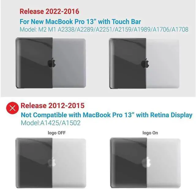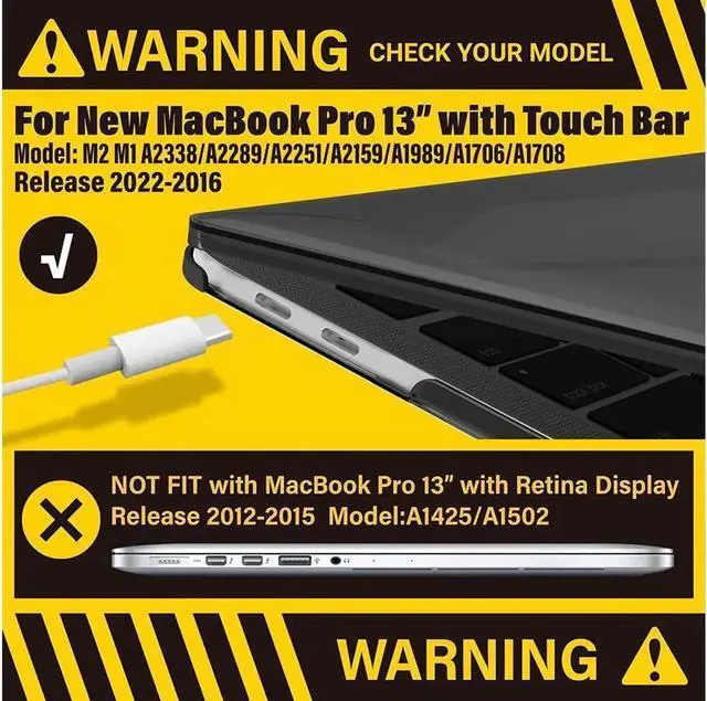Compatibility: - Case for 2022-2016 New MacBook Pro 13 inch (Models: M2 / M1 / A2338 / A2289 / A2251 / A2159 / A1989 / A1706 / A1708) -- Release in 2022 2021 2020 2019 2018 2017 2016 --- MUHN2LL/A, MUHQ2LL/A, MUHP2LL/A, MUHR2LL/A, MV962LL/A, MV992LL/A, MV972LL/A, MV9A2LL/A -- MR9Q2LL/A, MR9R2LL/A -- MPXV2LL/A, MPXX2LL/A, MPXW2LL/A, MPXY2LL/A, MPXQ2LL/A, MPXR2LL/A, MPXT2LL/A, MPXU2LL/A -- MLL42LL/A, MLUQ2LL/A, MLH12LL/A, MLVP2LL/A, MNQF2LL/A, MNQG2LL/A. Please double check your MacBook's model number "A1xxx" on the bottom of the laptop.