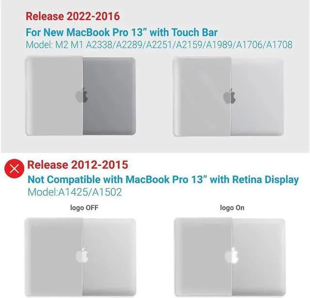 Compatibility: - Case for 2022-2016 New MacBook Pro 13 inch (Models: M2 / M1 / A2338 / A2289 / A2251 / A2159 / A1989 / A1706 / A1708) -- Release in 2022 2021 2020 2019 2018 2017 2016 --- MUHN2LL/A, MUHQ2LL/A, MUHP2LL/A, MUHR2LL/A, MV962LL/A, MV992LL/A, MV972LL/A, MV9A2LL/A -- MR9Q2LL/A, MR9R2LL/A -- MPXV2LL/A, MPXX2LL/A, MPXW2LL/A, MPXY2LL/A, MPXQ2LL/A, MPXR2LL/A, MPXT2LL/A, MPXU2LL/A -- MLL42LL/A, MLUQ2LL/A, MLH12LL/A, MLVP2LL/A, MNQF2LL/A, MNQG2LL/A. Please double check your MacBook's model number "A1xxx" on the bottom of the laptop.