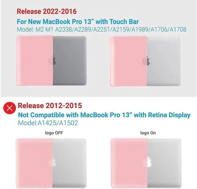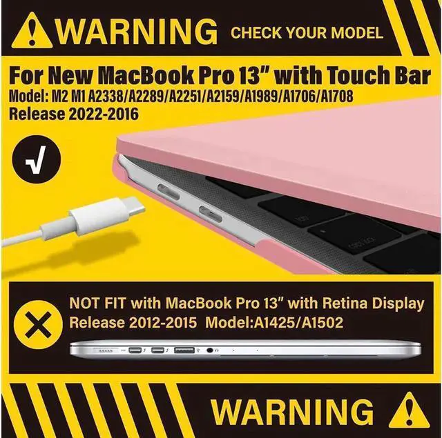 Compatibility: - Case for 2022-2016 New MacBook Pro 13 inch (Models: M2 / M1 / A2338 / A2289 / A2251 / A2159 / A1989 / A1706 / A1708) -- Release in 2022 2021 2020 2019 2018 2017 2016 --- MUHN2LL/A, MUHQ2LL/A, MUHP2LL/A, MUHR2LL/A, MV962LL/A, MV992LL/A, MV972LL/A, MV9A2LL/A -- MR9Q2LL/A, MR9R2LL/A -- MPXV2LL/A, MPXX2LL/A, MPXW2LL/A, MPXY2LL/A, MPXQ2LL/A, MPXR2LL/A, MPXT2LL/A, MPXU2LL/A -- MLL42LL/A, MLUQ2LL/A, MLH12LL/A, MLVP2LL/A, MNQF2LL/A, MNQG2LL/A. Please double check your MacBook's model number "A1xxx" on the bottom of the laptop.