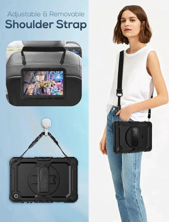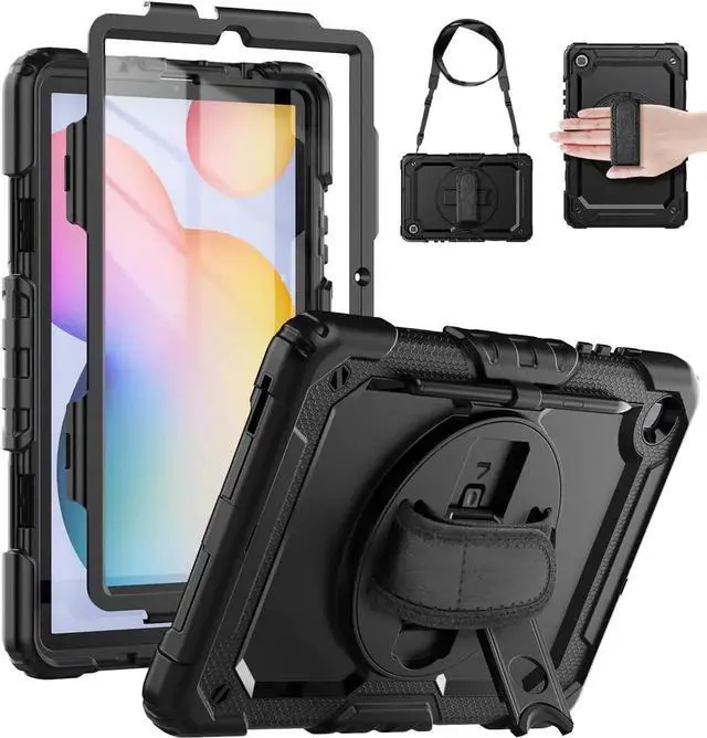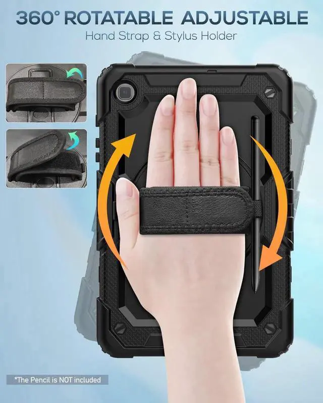 Hand/Shoulder Strap: The Galaxy S6 Lite Case has a rotating hand strap at the back that doubles as a convenient stand solution. Its got a convenient 360-degree rotating swivel that allows you to position the tablet vertically and horizontally for reading or viewing. There is also a shoulder strap to let you or your kids carry the SamSung S6 Lite Tablet easily without the need to keep your hands busy.