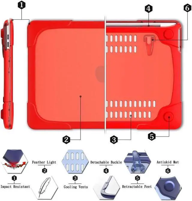 Humanized Design Two rows of bottom ventilation design provides fully heat release, helping your MacBook stay cool. Four anti-slip raised rubberized feet not only improve air ventilation, but also keep your case standing firmly in place.