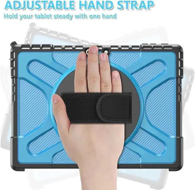 2-IN-1 HANDLE STRAP & STAND - 360 degree rotating hand strap, helps for holding the tablet while on the movie. Handle folds into upright stand for watching movies or improved typing angle.
