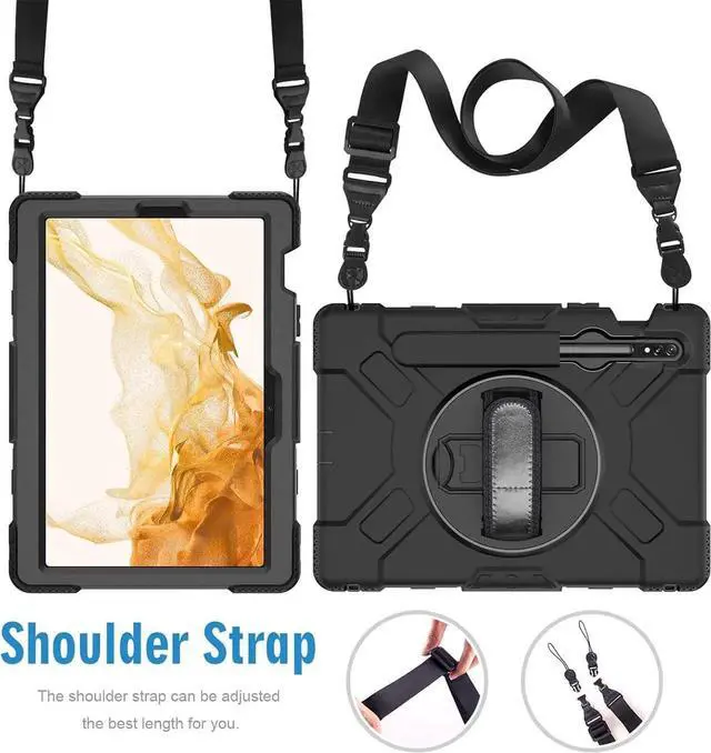 [ADJUSTABLE HAND STRAP & DETACHABLE SHOULDER STRAP] The strap can be adjusted depending on the size of the hand, helping you to grip the tablet safety. The shoulder strap can help conveniently carrying the tablet with a more secure way during hiking, traveling or hang it behind the headrest of the car seat to watch the video during the trip. Free your hands to facilitate your life.