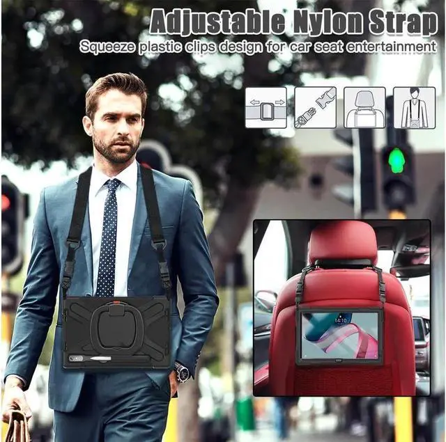 Adjustable and removable shoulder strap provides you ultimate convenience for carrying around; You can even mount it to car headrest for back seat hand-free viewing, ideal for working, studying and travelling