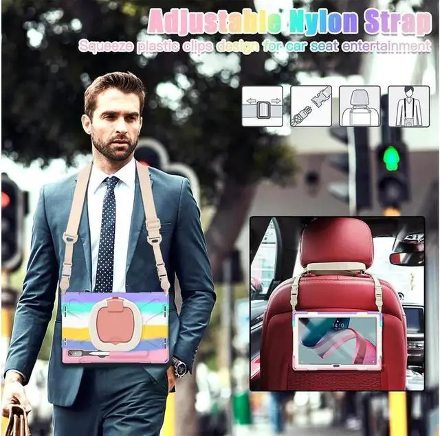 Adjustable and removable shoulder strap provides you ultimate convenience for carrying around; You can even mount it to car headrest for back seat hand-free viewing, ideal for working, studying and travelling