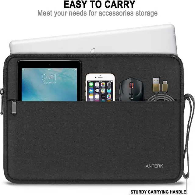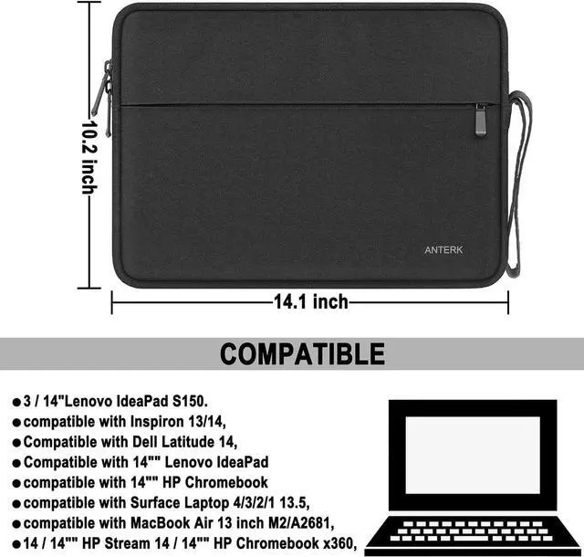 The front pocket dimensions: 13.3 x 9.5 inches (L x W). Extra pocket in front provides enough space to keep mouse cables earphone pens and notepads offering added convenience. PERFECT PROTECTION Our laptop sleeve is made of polyester material and waterproof cloth it is waterproof scratch resistant and dirt resistant making it an economical and durable laptop case; soft plush lining with a silky touch anti-drop and anti-scratch which can effectively prevent collision and impact protect your laptop from bumps shocks and accidental scratches. COMPATIBILITY ANTERK 14-inch Laptop Sleeve Compatible with MacBook Pro 14 inch 2024-2021 M3 A2918 A2992 M2 A2779 M1 A2442 Pro Max with Touch ID compatible with MacBook Air 13 inch M2/A2681 M1/A2337 A2179 A1932 2010-2022 compatible with 14 HP Chromebook 14 / 14 HP Stream 14 / 14 HP Chromebook x360 Compatible with Latitude 14 compatible with Inspiron 13/14 compatible with Surface Laptop 4/3/2/1 13.5 Compatible with 14 IdeaPad 3 / 14 IdeaPad S150. EASY TO CARRY Featuring a sturdy carrying handle for Long Time Comfortably Carrying this laptop sleeve offers added convenience while on the go. Allows you to switch between a laptop briefcase handbag and laptop sleeve bag. ANTERK Laptop Case Perfect For Women And Men's Business Travel Daily Use On Trip.