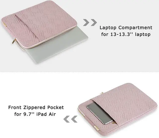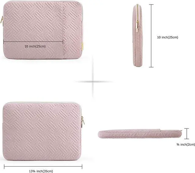 LAPTOP- Dimensions: 13.8 ''L x 0.8 ''W x 10''H the front pocket: 10''L x 10''W. Extra front zipped pocket offers enough space to keeping charge mouse cable phone memory cards external hard drive pens 9.7 '' iPad etc. SHOCKPROOF- Featue three layers' protection with waterproof layer shockproof layer and fluffy fabric inner layer the product can effectively absorb impacts and reduce damages caused by accidentally bumping and protects your notebook from scratches. WATER REPELLENT- Made of water-resistant polyester which obstructs water and vapor effectively. Don't worry about getting your laptop computer and accessories wet from splashing water or rain. CONVENIENT DESIGN- Double-way zipper closure allows you to take laptop easily. Slim and lightweight makes it easier to slide into your tote bag briefcase backpack or other bag. Top-loading zipper on the sleeve glides smoothly and allows convenient access to your laptop computer. COMPATIBLE WITH ALL 13- 13.3 -INCH
