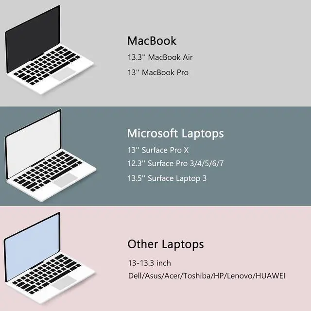 LAPTOP: MacBook Air 13 inch M2/A2681 M1/A2337 A2179 A1932 2010-2022 compatible with MacBook Pro 13 inch M2/A2686 M1/A2338 A2251 2008-2022; Compatible with Surface Book 3/2/1 13.5 compatible with Surface Laptop 4/3/2/1 13.5; Compatible with Latitude 14 compatible with Inspiron 13/14; Compatible with HP Elitebook 13.3 /Spectre X360 13.3 /Envy 13/Stream 13/Stream 14/Pavilion 14; Compatible with ThinkPad X1 Carbon; compatible with IdeaPad 13/14; Compatible with RAZER Blade Stealth 13.3
