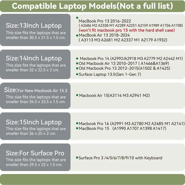 Perfect Size: Our laptop sleeve is compatible with New MacBook Pro 13 2016-2022 ( A2686 M2 A2338 M1A2289 A2251 A2159 A1989 A1706 A1708) New MacBook Air 13 2018-2024 ( A3113 M3 A2681 M2 A2337 M1 A2179 A1932). Other laptops that are smaller than these dimensions- 30.5 x 21.5 x 1.5 cm. If your laptops are too small than the above dimensions then the sleeve will be a loose fit. If one of your laptop's width depth or height is larger then pls consider the next sizeExcellent