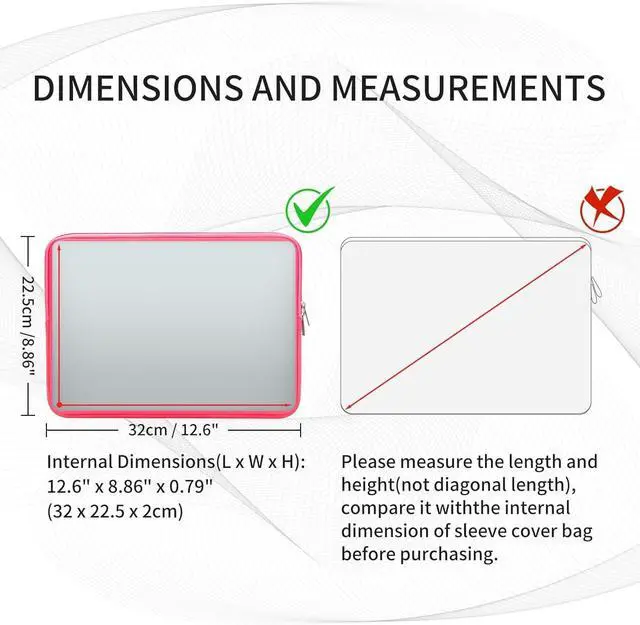 NOTICE: The [13] sleeve Specially Compatible with 13.3 MacBook Air Pro A3240 A3113 A2681 A2337 A2338 A1932 A2179 A1989 A1706 A1708 A2159 A2179 A2251. Internal Dimensions (L x W x