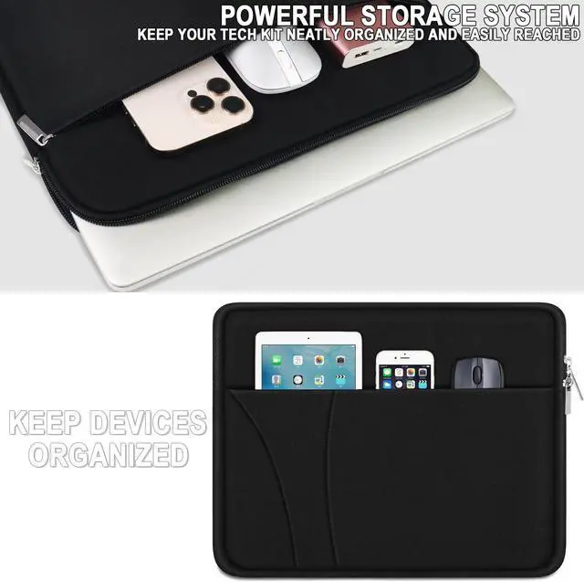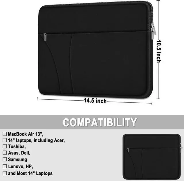 Perfect Fit External Dimensions: 14.5 x 10.5 x1 (L x W x H). This 14 inch Laptop Sleeve Compatible with MacBook Pro 14 MacBook Air 13 14 laptops including HP Toshiba and Most 14 Laptops/Chromebooks/Ultrabooks/Netbooks. High Quality MaterialCrafted with high-quality neoprene material our Laptop sleeve offers a ultra slim lightweight design and superior protection to protect laptop/notebook from dust bumps scratches scuffs and spills. Additional Storage SpaceThis laptop comes with an external pocket on its sleeve which has enough space to store your mouse cable phone memory card external hard drive pen and more. The zipper slides smoothly making it easy to access the laptop. It is perfect for anyone who wants a 15- 15.6 inch laptop case. Slim And LightweightDouble-way zipper closure allows you to take laptop easily. Slim and lightweight makes it easier to slide into your tote bag briefcase backpack or other bag. Top-loading zipper on the sleeve glides smoothly and allows convenient access to your laptop computer. Laptop Protection CaseOur laptop sleeve features durable quality and great protection it is sleek stylish and well-made which is reliable and long-lasting.