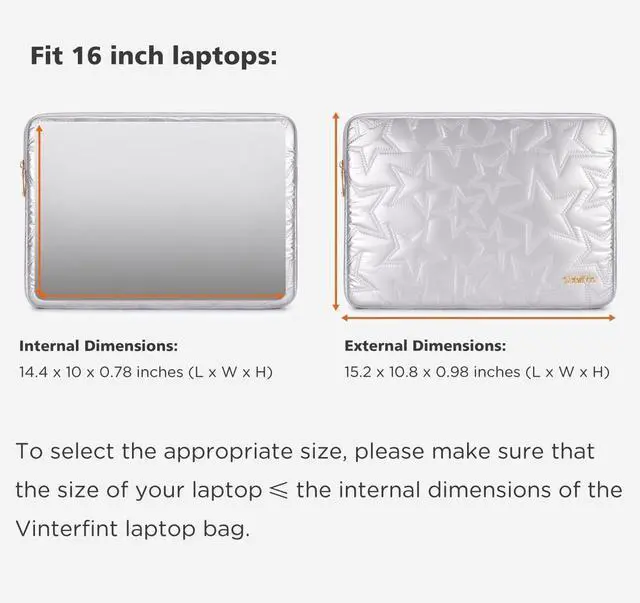 External Dimensions: 15.2 x 10.8 x 0.98 inches (L x W x H). To select the appropriate size please make sure that the size of your laptop the internal dimensions of the Vinterfint laptop bag.