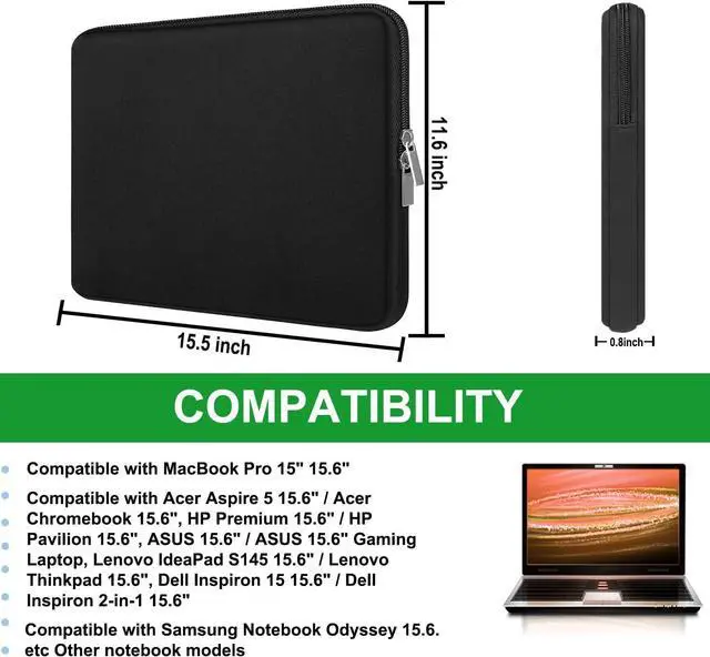 Inch laptop sleeve dimensions: 15.5 x 11.6 x 0.8 inch (L x W x H). Our This laptop sleeve is suitable for all 15.4 15.6 inch laptops. Constructed with a modern slim and lightweight design to accommodate daily use and protection needs. Soft And ProtectivePremium thickened water-resistant neoprene material offers a ultra slim lightweight design and superior protection to protect laptop/notebook from dust bumps scratches scuffs and spills. Convenient DesignDouble-way zipper closure allows you to take laptop easily. Slim and lightweight makes it easier to slide into your tote bag briefcase backpack or other bag. Top-loading zipper on the sleeve glides smoothly and allows convenient access to your laptop computer. CompatibilityOur laptop sleeve is Compatible with most popular up to 15.6 inch notebooks Compatible with MacBook Pro 15 15.6 Compatible with Aspire 5 15.6 / Chromebook 15.6 HP Premium 15.6 / HP Pavilion 15.6 15.6 / 15.6 Gaming Laptop IdeaPad S145 15.6 / Thinkpad 15.6 Inspiron 15 15.6 / Inspiron 2-in-1 15.6 Compatible with Notebook Odyssey 15.6. etc Other notebook models. Fashionable DurableOur laptop bag sleeve features durable quality and great protection it is sleek stylish and well-made which is reliable and long-lasting. could be served as messenger bag briefcase laptop bag.