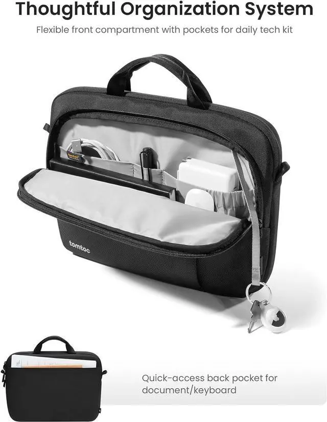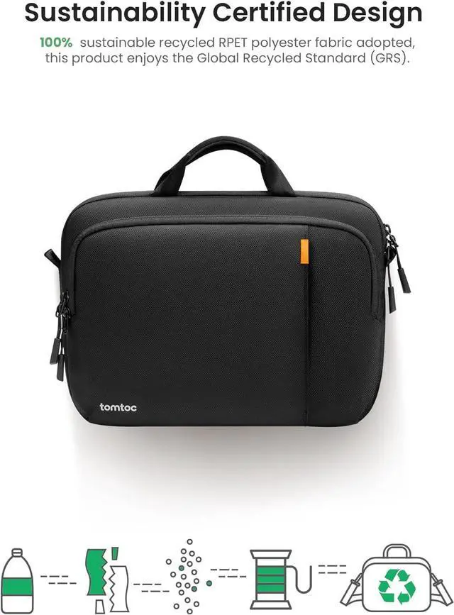 Durability & Sustainable Ethos: At tomtoc we take every step to save our planet. Crafted from sustainable recycled RPET polyester 210D fabric this briefcase proudly holds the GRS certification. Besides the briefcase underscores its durability by including premium YKK zippers and buckles ensuring a blend of quality and sustainability values with each useComfortable with ergonomic design: For those long commutes or travels the ergonomic removable shoulder strap and padded carrying handles ensure maximum comfort. The Defender-A30 Laptop shoulder bag doesn't just protect your MacBook; it ensures a comfortable and variable user experience all along the wayWhat