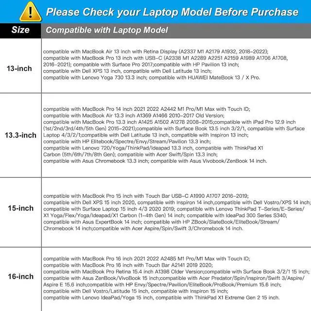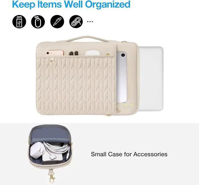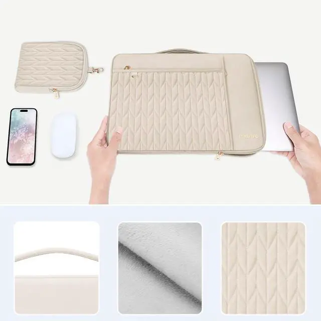 Front vertical pocket dimensions: 11.02 x 9.06 inches (L x W). Made with durable petal quilted polyester material. Features a polyester foam padding layer and fluffy cushion for bump and shock absorption and protection of your device against dust dirt bump shock and accidental scratches. Front horizontal & vertical pockets provide enough space to keep pens & notebooks offering added convenience. Additional small storage pouch bag for you to storage laptop mouse and earphone. Same color as the big sleeve bag harmony and stylish. Simple and exquisite petal quilted appearance carrying sleeve case cover bag is ideal for you to take your laptop out. Considerate design is the back trolley suitcase belt for ease use during business trip. It is really convenient for your happy journey to any where. Slim and lightweight; does not bulk your laptop up and can easily slide into your briefcase backpack or other bag. Compatible with MacBook Pro 16 inch 2024-2021 M4 A3403 A3186 M3 A2991 M2 A2780 M1 A2485 Pro Max Touch ID compatible with MacBook Pro 16 A2141 2019 2020 compatible with MacBook Pro Retina 15.4 A1398; Compatible with Surface Book 3/2/1 15; Compatible with ZenBook/VivoBook 15; Compatible with Swift 3 14/Swift 5 15.6 compatible with Aspire 3/5/7 15.6; Compatible with HP ProBook/Spectre x360/Envy x360/HP Omen/Pavilion x360 15.6; Compatible with XPS/Vostro/Latitude 15.