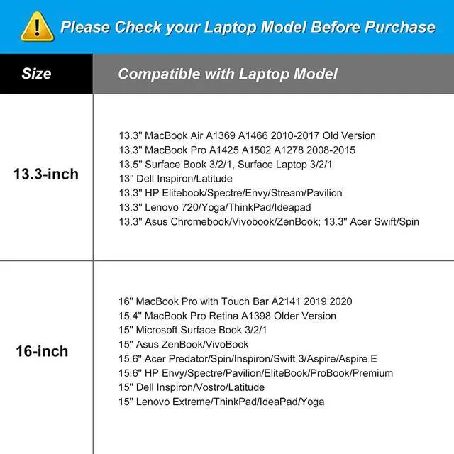External dimensions: 14.37 x 0.79 x 10.24 inch (L x W x H). The front horizontal side pocket dimensions: 13.39 x 6.89 inch (L x W). The front vertical small pocket dimensions: 7.87 x 5.51 inch (L x W). 360 degree all around protective reinforced interior edge protect your laptop from any accidental dropping. Extendable handle design makes it to carry your laptop around in comfort you can also tuck away the handle. Side opening zipper design avoid accidental dropping of your laptop while carrying. The laptop sleeve with right pocket outer polyester fabric of the case enable you to carry your laptop / notebook / Ultrabook computer in a uniquely sleek style. Features a polyester foam padding layer and fluffy cushion for bump and shock absorption and protection of your device against bump shock and accidental scratches. Considerate design is the back trolley suitcase belt for ease use during business trip. It is really convenient for your happy journey to any where. Slim and lightweight; does not bulk your laptop up and can easily slide into your briefcase backpack or other bag. This protective carrying sleeve case cover bag with handle and pocket is ideal for you to take your laptop out. Compatible with MacBook Air 13 13.3 13.6 inch M4 A3240 M3 A3113 M2 A2681 M1 A2337 A2179 A1932 A1369 A1466 2010-2025 compatible with MacBook Pro 14 inch 2025-2021 M4 A3112 A3185 A3401 M3 A2918 A2992 M2 A2779 M1 A2442 compatible with MacBook Pro 13 2008-2025 M2 A2338 M1 A2251 A2289 A2159 A1989 A1708 A1706 A1425 A1502 A1278; Compatible with Surface Laptop 13.8 /Surface Book 3/2/1 13.5 /Surface Laptop 4/3/2/1 13.5; Compatible with XPS/Latitude 13; Compatible with HP Elitebook/Spectre/Envy/Stream 13.