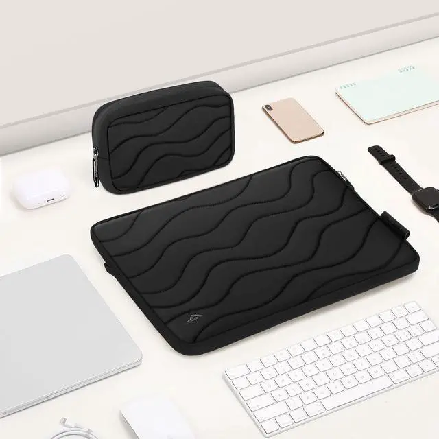 External Dimensions: 14.17 x 10.23 x 0.79 inches (L x W x H). The additional small pouch bag dimension: 7.28 x 4.52 x 1.18 inch (L x W x H). Made of soft water ripple quilted puffy polyester features 360 degree all around protective reinforced interior edge carrying case bag better protect your valuable laptop from dust dirt scratches & accidental dropping. Additional small storage pouch bag for you to store laptop mouse and earphone. Same color as the big sleeve bag harmony and stylish. This durable protective carrying sleeve case cover bag with small pouch is ideal for you to take your laptop out. Slim and lightweight; does not bulk your laptop up and can easily slide into your briefcase backpack or other bag. Top-loading zipper on the sleeve glides smoothly and allows convenient access to your laptop computer. The bag is perfect for working traveling daily use and business travel. Compatible with MacBook Pro 14 2025-2021 M5 M4 M3 M2 M1 A3434 A3112 A3185 A3401 A2918 A2992 A2779 A2442 compatible with MacBook Air 13 2017-2010 A1369 A1466 compatible with MacBook Pro 13 A1425 A1502 A1278 2008-2015; Compatible with Surface Book 3/2/1 13.5 / Surface Laptop 6/5/4/3 13.5 /Surface Laptop 13.8; Compatible with Latitude/Chromebook 13.3; Compatible with HP Elitebook/Spectre/Envy/Stream 13.3; Compatible with IdeaPad/ThinkPad Yoga 13.3; Compatible with Chromebook Spin 13.3.