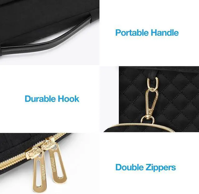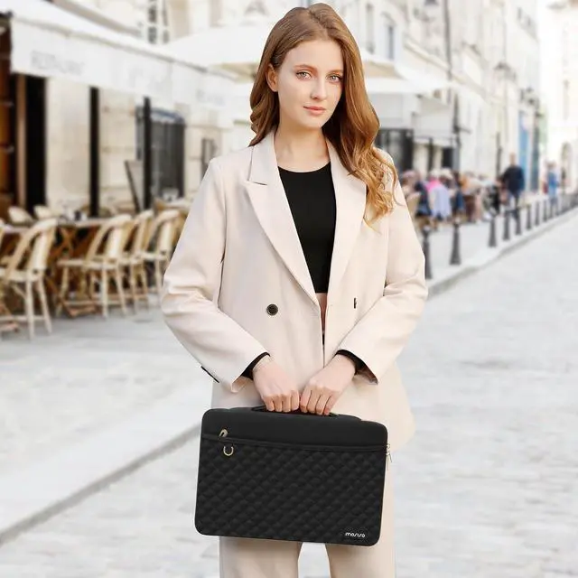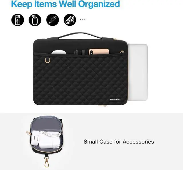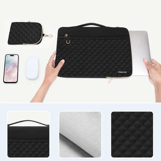The front horizontal pocket dimensions: 11.81 x 7.08 inches (L x W). The additional small pouch bag dimension: 4.92 x 6.3 x 0.98 inch (L x W x H). 360 degree all around protective reinforced interior edge briefcase carrying case bag protect your laptop from any accidental dropping. Features a polyester foam padding layer and fluffy cushion for bump and shock absorption and protection of your device against dust dirt bump shock and accidental scratches. Front horizontal pocket provide enough space to keep pens & notebooks offering added convenience. Additional small storage pouch bag for you to storage laptop mouse and earphone. Same color as the big sleeve bag harmony and stylish. Extendable handle design makes it to carry your laptop around in comfort. Side opening zipper design avoid accidental dropping of your laptop while carrying. Considerate design is the back trolley suitcase belt for ease use during business trip. It is really convenient for your happy journey to any where. Made with soft square quilted polyester material simple and exquisite square quilted appearance carrying sleeve case cover bag with handle and pocket is ideal for you to take your laptop out. Compatible with MacBook Pro 14 inch 2024-2021 M4 A3112 A3185 A3401 M3 A2918 A2992 M2 A2779 M1 A2442 Pro Max with Touch ID compatible with MacBook Air 13 inch A1369 A1466 2010-2017 compatible with MacBook Pro 13 inch A1425 A1502 A1278 2008-2015; Compatible with Surface Book 3/2/1 13.5 compatible with Surface Laptop 4/3/2/1 13.5; Compatible with Latitude 14; Compatible with HP Elitebook 13.3 /Spectre X360 13.3 /Envy 13/Stream 13/Stream 14/Pavilion 14; compatible with IdeaPad 13/14.