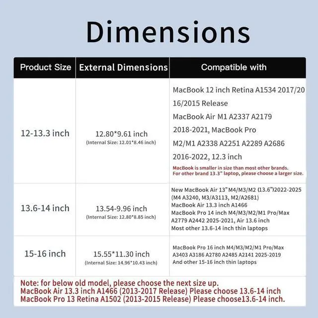 *Note: For the two models MacBook Air 13.3 inch A14662017-2013 Release) and MacBook Pro 13 Retina A15022015-2013 Release) please choose 13.6 -14 inch.? New MacBook Air/Pro 13 inch M4/M3/M2 (2025-2022 Release) is actually 13.6 inch in size. Please choose this size( 13.6 -14). It is compatible with MacBook Air 13 inch M4/M3/M2(2025-2022 Release)M4 A3240 M3 A3113 M2 A2681.?