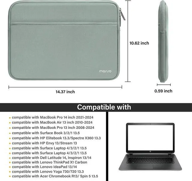The front horizontal pocket dimensions: 11.41 x 6.3 inches (L x W). Made with neoprene material a top opening zipper gliding smoothly and allows convenient access to your device. Slim and lightweight does not bulk your device up and can easily slide into your briefcase backpack or other bag. Extra front horizontal pocket in front provides enough space to keep mouse earphone pens and notepads offering added convenience. This protective carrying sleeve case cover bag with pocket is ideal for you to take your laptop notebook computer out. Features a neoprene foam padding layer and fluffy fleece fabric lining for bump and shock absorption and protection of your computer from accidental scratches. Compatible with MacBook Air 13 13.3 13.6 M4 A3240 M3 A3113 M2 A2681 M1 A2337 A2179 A1932 A1369 A1466 2010-2025 compatible with MacBook Pro 14 2025-2021 M5 M4 M3 M2 M1 A3434 A3112 A3185 A3401 A2918 A2992 A2779 A2442 compatible with MacBook Pro 13 2008-2025 M2 A2338 M1 A2251 A2289 A2159 A1989 A1708 A1706 A1425 A1502 A1278; Compatible with Surface Laptop 13.8 /Surface Book 3/2/1 13.5 /Surface Laptop 4/3/2/1 13.5; Compatible with XPS/Latitude 13; Compatible with HP Elitebook/Spectre/Envy/Stream 13.