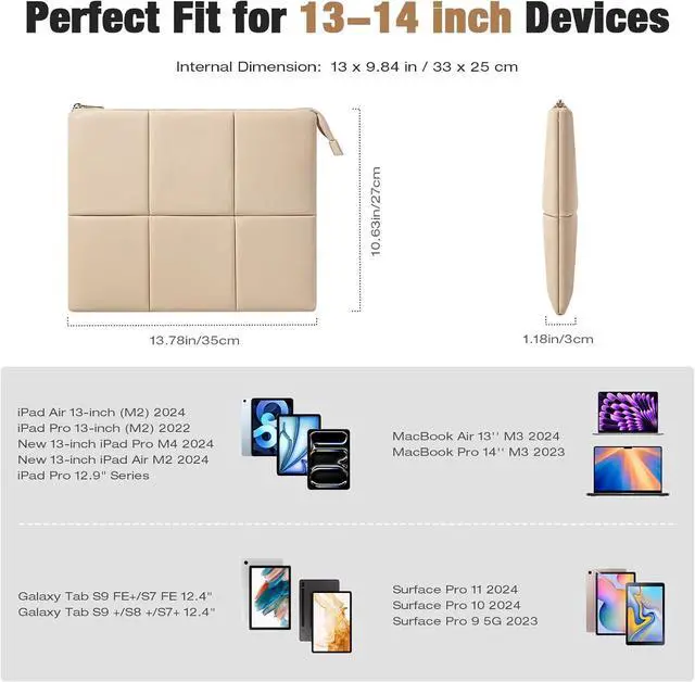 Suitable Model - The laptop is compatible with most 13.3 - 14 inch Macbook/Laptops/Ultrabook/Chromebooks MacBook Air 13'' M3 2024 MacBook Pro 14'' M3 2024/2023 MacBook Pro 13 M2/M1 iPad Air 13-inch (M2) 2024/ 2022 New 13-inch iPad Pro M4 2024 New 13-inch iPad Air M2 2024 iPad Pro 12.9 Series Galaxy Tab S9 FE+/S7 FE 12.4 Galaxy Tab S9 +/S8 +/S7+ 12.4 Surface Pro 11/10 2024 Surface Pro 9 5G 2023Premium Material - With PU leather exterior and thick sponge paddingthe iPad travel case feels more delicate and smooth and it can also effectively protect your device against fluids spills and light rain.