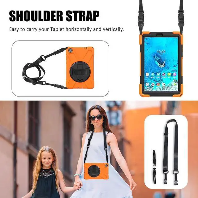 2-IN-1 HANDLE & STAND + REMOVABLE SHOULDER STRAP - 360 degree rotating waterproof material hand strap, helps for holding the tablet while on the movie. Handle folds into upright stand for watching movies or improved typing angle. Box includes expandable & detachable shoulder strap. Straps attach to holes forming carrying case like messenger bag / neck bag / sling / harness or cross body holster. You can even strap mount to car headrest for back seat entertainment