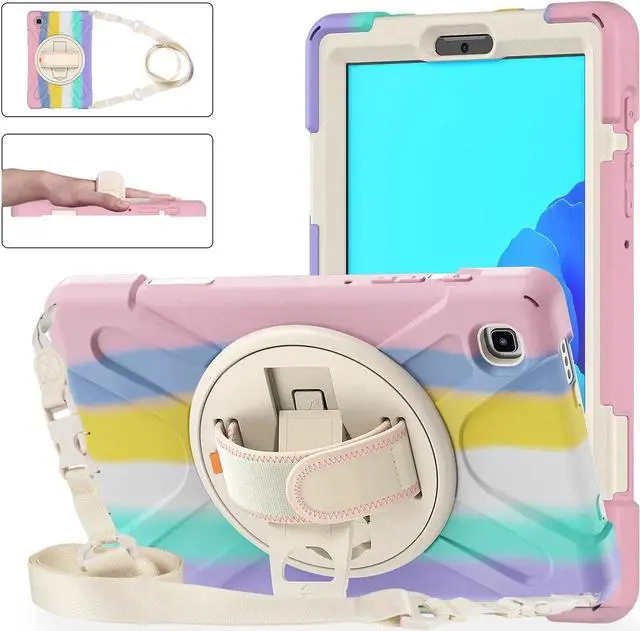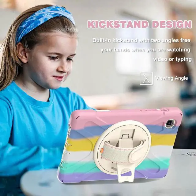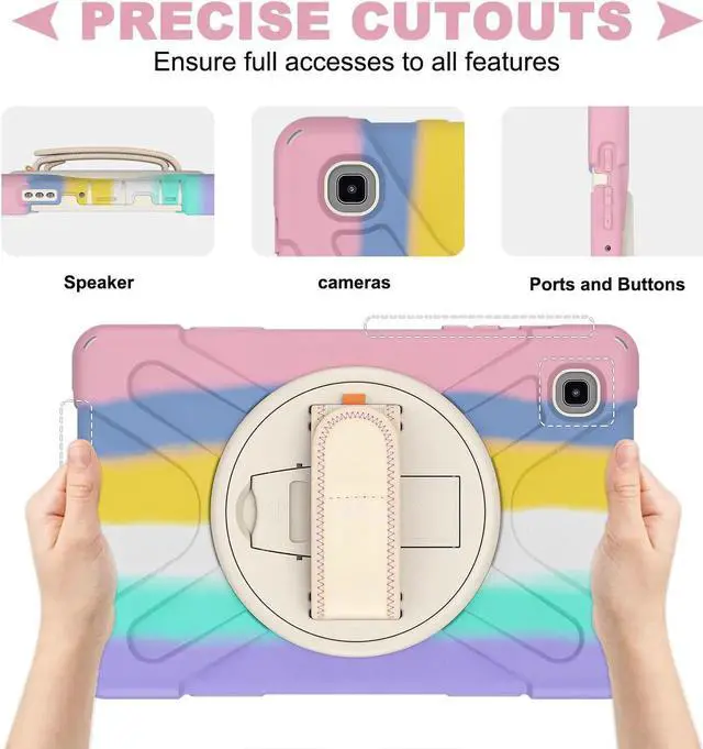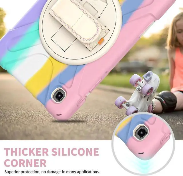 360° Swiveling Stand & Hand Strap --- Located on the back of Galaxy Tab A7 Lite 8.7 shockproof case 2021, built-in 360 degree rotating kickstand and adjustable handle hand strap provides a more flexible and convenient way to use your tablet during work, study or journey, ideal for students,teachers,engineers,cashiers and waiters,etc.