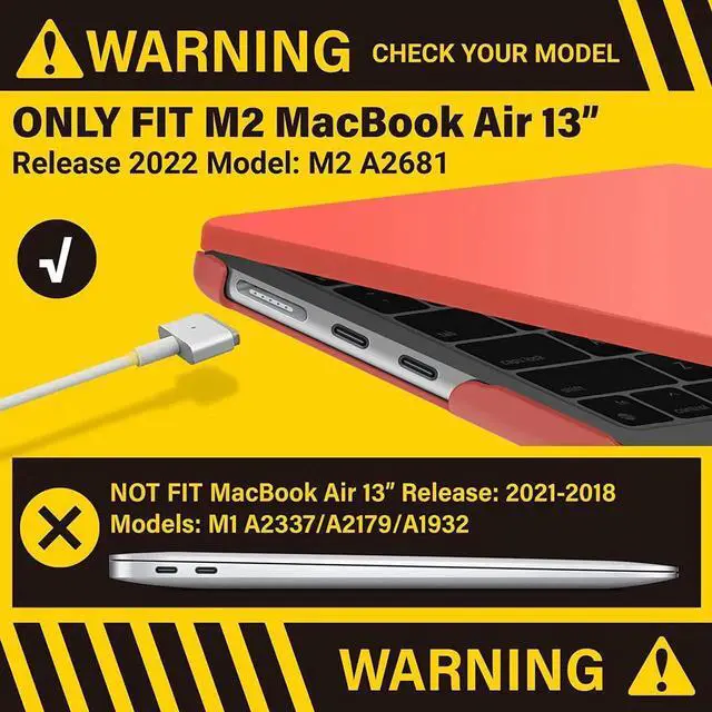 • ONLY compatible with MacBook Air 13.6 inch M2 Chip with Liquid Retina Display & Touch ID 2022 Release (model: A2681 - MLXW3LL/A, MLXX3LL/A, MLXY3LL/A, MLY03LL/A, MLY13LL/A, MLY23LL/A, MLY33LL/A, MLY43LL/A). WARNING: This case is NOT compatible with other model laptops.