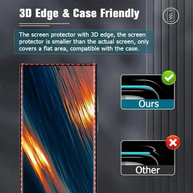 3D Curved Fit & Case Friendly --- This protector covers the rounded edges of the s23 ultra ,exquisitely polished, 2.5D rounded edges technique makes curved edges of the film to perfectly fit curved corners and edges of the phone, 1.4 mm margin around the edge of the device to be compatible with MOST cases. 99.9% ultra-clear high definition transparency, drop protection and full compatibility with touchscreen sensitivity.