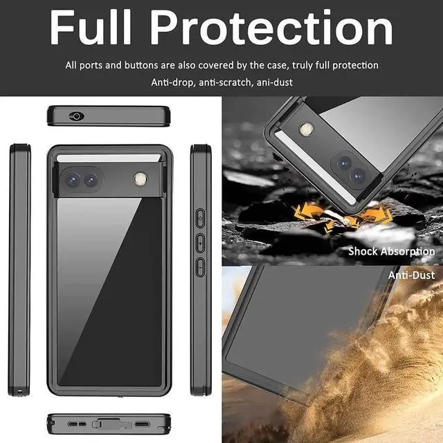 Full Protection with Built-in Screen Film --- The Google Pixel 7A waterproof bumper adopts dual material, back cover uses premium transparent hard PC and Soft TPU edge, which has strong shock absorption, prevent your phone damaging form dropping and restore the original color of your phone. With clear built-in screen protector, anti-scratch and dust-proof but not affect touch sensitivity and sound quality. All ports are also covered by the case, truly full protection.