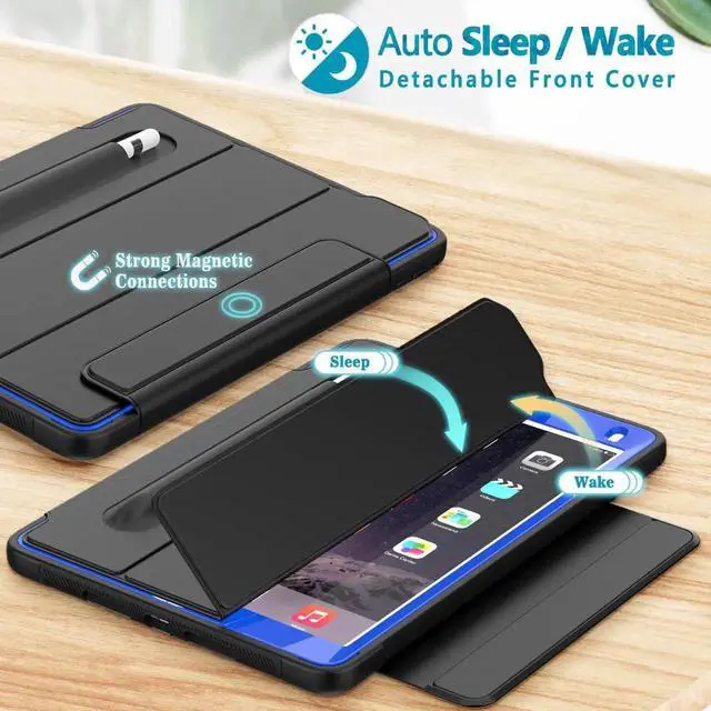 Tri-fold Stand Function: The removable magnetic front cover can be folded into a triangle as a kickstand to prop your iPad up in two standing positions, always giving you comfortable hands-free angles for movie-viewing, typing, reading or face-to-face chatting with friends for any situation, anywhere in your home, office or outside. Convenient Pencil Holder & Precise Cutout: This iPad case is featured by an extra stylus holder. Easily plug in/out, making the pencil always at your hand whenever you need it. Precise cutout allows full access to all the buttons, ports or features without removing the case. Well-designed dust cover for each port prevents dust getting in.