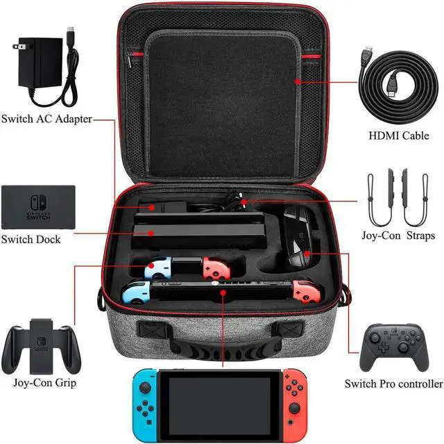 • Large Capacity: Compatible with Nintendo Switch Console x 1, Charging Dock x 1, AC Adapter x 1, Joy-Con Grip & Joy-Con x 1,Pro Controller x 1, Game Cards x 21, Joy-Con Straps x 2, HDMI Cable x 1, other small accessories in the mesh pouch.