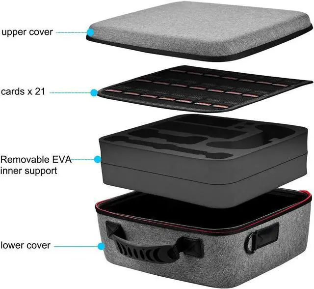 Capacity: Compatible with Nintendo Switch Console x 1, Charging Dock x 1, AC Adapter x 1, Joy-Con Grip & Joy-Con x 1, Pro Controller x 1, Game Cards x 21, Joy-Con Straps x 2, HDMI Cable x 1, other small accessories in the mesh pouch.