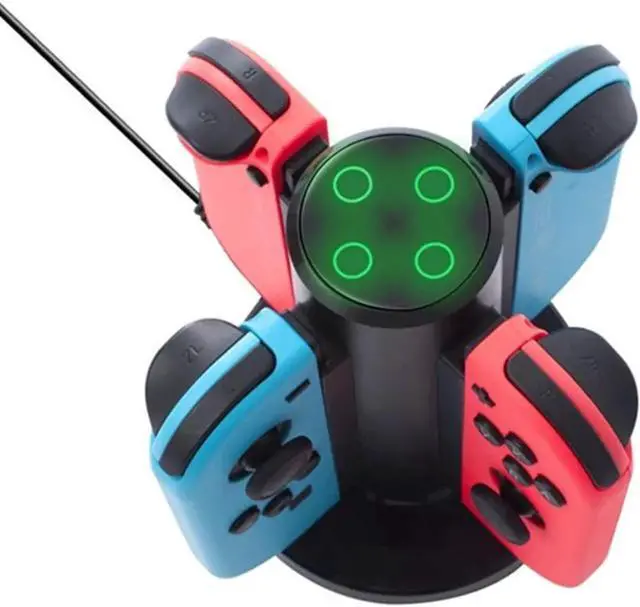 Red: charging, Green: Fully charged. Easy to slide in and start charging in seconds. Unique cylindrical shape design with non-slip base for stability. USB input. Package includes a charging dock and a USB cable, not includes AC adapter and Joy-Cons. Charging dock for Nintendo Switch Joy Con controllers, it charges up to 4 Joy-Cons at a time. Just simply slide the Joy-Con Controllers down and wait until each LED changes from red to green.