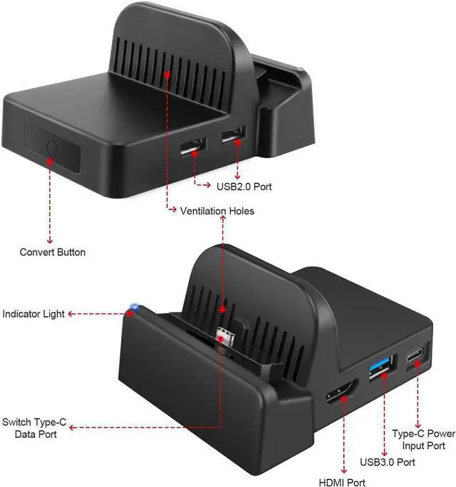 Product Feature: - Smaller, lightweight and portable - This dock is small enough to put in pocket. It's easy to carry around while traveling or going out. - Charge while playing - Charge your Nintendo Switch while you play games on it in Tabletop mode. There's no risk of overheat and scratching, since switch just sits on top of the dock which offers good ventilation to keep switch cool. - Switch HDMI Adapter to play on TV - Take this mini lightweight replacement HDMI converter dock to connect switch with hotel or friend's TV or computer monitor, and get the same image quality as the original dock, up to 1080p. - Play in table-top mode - Put this switch stand on any surface and enjoy your game without holding the console. It also allows you to play with others in a portable manner.