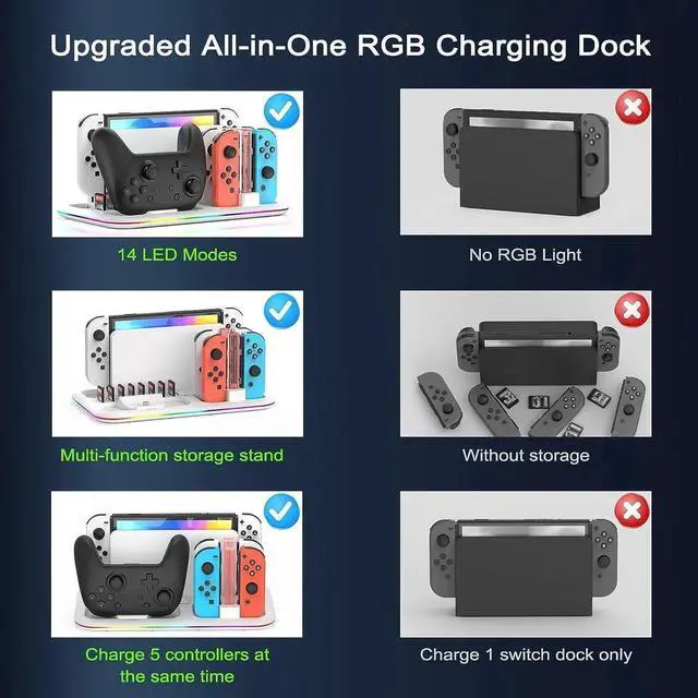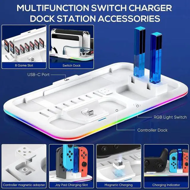 Well-organized Switch Dock Station Accessories --- This compact and lightweight switch controller charger dock integrates lighting, charging and organizing. Not only suitable to recommend to players who like to play switch games, but also neatly storage for your switch dock and gaming accessories. It would be the best rgb controller charging dock for your Switch accessories.(Noted: Not included official Switch TV dock and Joycons & Pro controller).