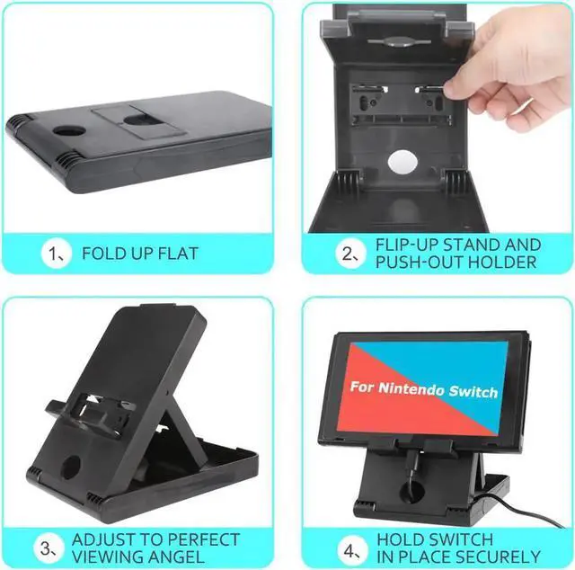 Features: DESIGNED FOR NINTENDO SWITCH - Exclusive designed to offer a Specilized Stand for your Switch Gamepad. You can use it to store and display your Switch. (cables and console not included) ADJUSTABLE ANGLES - The stand supports multi-angle display to suit your personal perference & comfort while playing. PLAY WHILE CHARGING - The Switch stand designed space which allows the charging cable to pass through it, allowing you to charge your Nintendo Switch while playing. No more worrying when you see the low power light in the middle of your game play. STURDY AND SECURE - Our stand for Nintendo Switch has 4 rubber pads on the bottom keep it solidly in place during gaming. Two prongs are capable of holding your Switch firmly and securely in place. Large airflow vents prevent your device from overheating while playing games. TRAVEL FRIENDLY AND PORTABLE - This stand is easy to pack away with most carrying case. Lightweight and pocket sized, the smart collapsible design is simple and easy to use. Travel friendly and portable, it can be easily packed away when not in use.