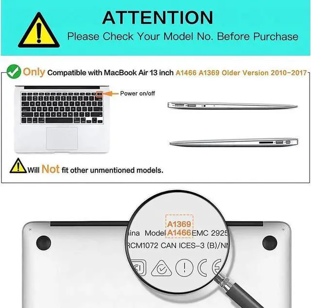 Designed ONLY to be compatible with MacBook Air 13 inch (Models: A1369 & A1466, Older Version 2010-2017 Release). Please kindly check the model number "A1xxx" on the back of the laptop before your purchase, make sure you choose the exact same model number as the listing title stated "A1369" or "A1466".