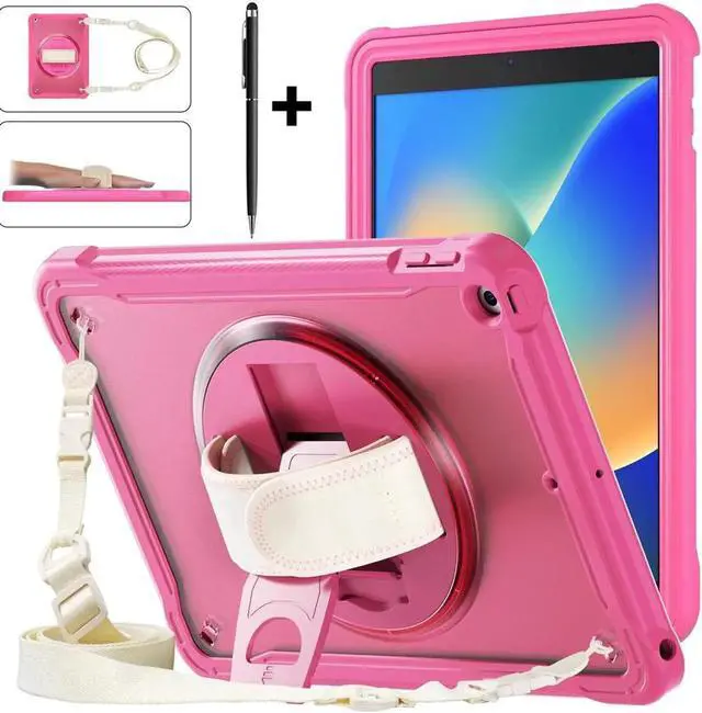 Case For iPad 9th 8th 7th Generation 10.2 inch 2021 2020 2019 Shcokproof Cover with Transparent Back, Pencil Holder, Rotating Stand, Hand/Shoulder Strap, Stylus Pen Rose Red