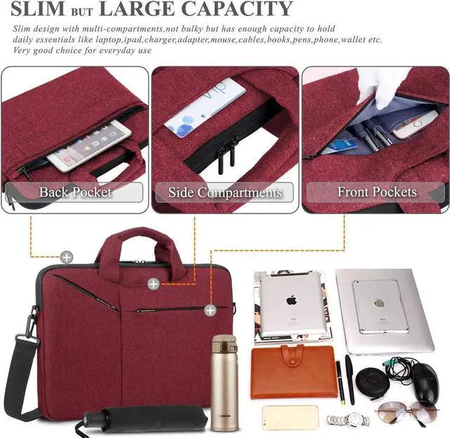 Slim & Multi-compartment -- this laptop bag is well-designed to be Not Bulky,but has enough capacity with various pockets to has enough capacity to hold daily essentials,like laptop,ipad,charger,adapter,mouse,cables,books,pens,phone,wallet etc.Very good choice for everyday use
