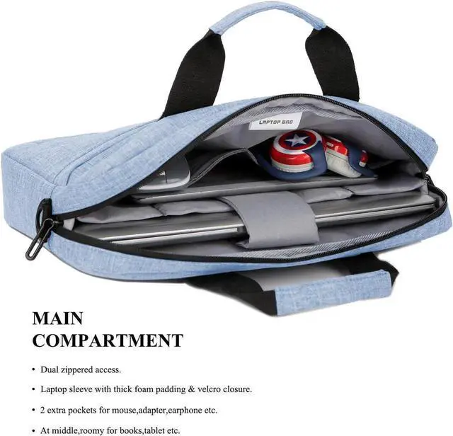 Made of quality anti-tear lightweight fabric,features a thick foam padded laptop sleeve with velcro strap in main compartment, that protects your laptop from accidental bump,shock,scratch. 2 non-zippered pockets can hold mouse,adapter, and middle is very roomy for big items, such as books.