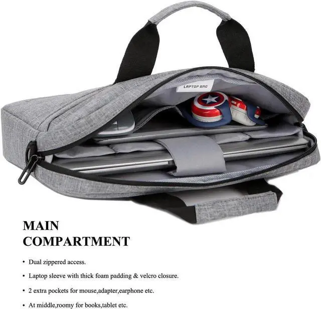 Made of quality anti-tear lightweight fabric,features a thick foam padded laptop sleeve with velcro strap in main compartment, that protects your laptop from accidental bump,shock,scratch. 2 non-zippered pockets can hold mouse,adapter, and middle is very roomy for big items, such as books.