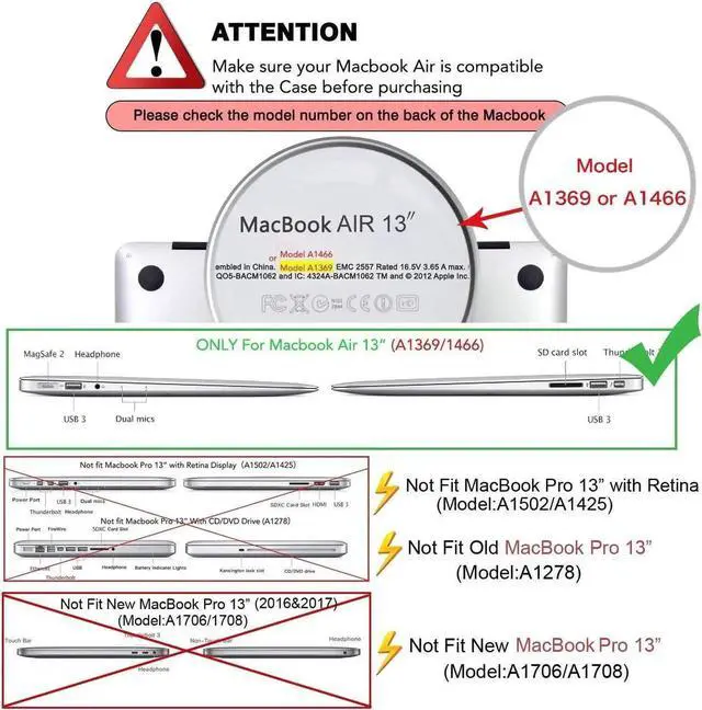 Model: A1466 Newest Release 2017 MQD32LL/A, MQD42LL/A Newest Release 2016 MMGF2LL/A, MMGG2LL/A Release 2015 MJVE2LL/A, MJVG2LL/A Release 2014, 2013, 2012 MD760LL/B, MD760LL/A, MD761LL/A MD231LL/A, MD232LL/A, Model: A1369