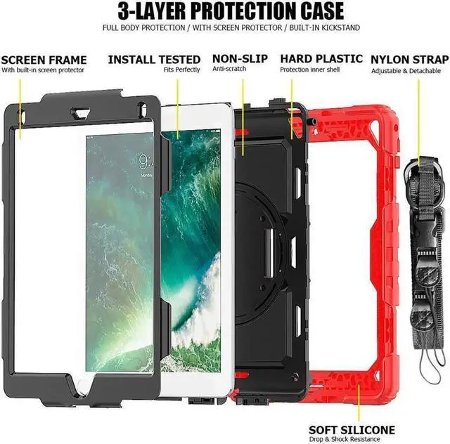 COMPATIBILITY: ONLY for New iPad 5th/6th Generation, as well as iPad Air 2 and iPad Pro 9.7. NOT fit other models. Please confirm the product before purchase. All in One 3 pieces combined installation, heavy duty full-body rugged case, with 360 rotating hand strap/portable shoulder strap, built-in kickstand, screen protector, and polycarbonate hard shell & silicone premium material. 360° Built-in Kickstand The built-in kickstand will set both hands free, whether you are watching video or playing games. 360° rotating Stand allows custome landscape or vertical viewing. Prevention of Drop Damages Effectively keeps iPad away from damages of dropping, bumps and shocks, its excellent safety performance will prolong the lifetime of the iPad 6th/5th. Adjustable/Detachable Shoulder/Hand Strap Adjustable/Detachable Shoulder Strap (total length: 172cm 67in) is more convenient for you to carry iPad. Easy to be attached and removed. With this strap, set your both hands free when you are working, playing game and on vacation, without the need of a purse, bag or backpack. It can hang from anywhere for better entertainment. It is also adjustable to fit with different occasions and for different people. The width is 2.5 cm (1in), which is comfortable when using it. Stylus Pencil Holder An extra Stylus Pencil Holder feature of this new generation case. Easily plug in/out, makes the pencil standing by your working. Unique Design to Protect iPad 6th/5th Better choice for your outdoor travelling, work and business. Create an ultimate protection for tablet, not only 360° Custome angles Hand Strap The adjustable/rotatable hand strap is made from premium soft fabric, fit for kids/adults, comfortable to hold th