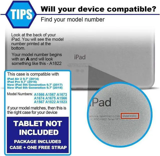 Compatibility: Designed specifically for New iPad 2017/2018 9.7 (iPad 5th/6th Generation)[A1822, A1823, A1893, A1954], for iPad air 2 [A1566, A1567] and for iPad pro 9.7 2016 [A1673, A1674, A1675]. Not for other iPad models. NO built-in screen film to keep the screen original touch feeling. Please confirm the product before purchase. Soft Hand Strap & Portable Shoulder Strap & Rotating Stand: Provide the securest protection and more convenience when you play or work with iPad. Hang it anywhere for your better entertainment, make your hands free. 360 Degree rotating Kickstand provides multi-angle viewing, with soft handle strap, easier to use your iPad in your outdoor travelling, working, gaming with kids.