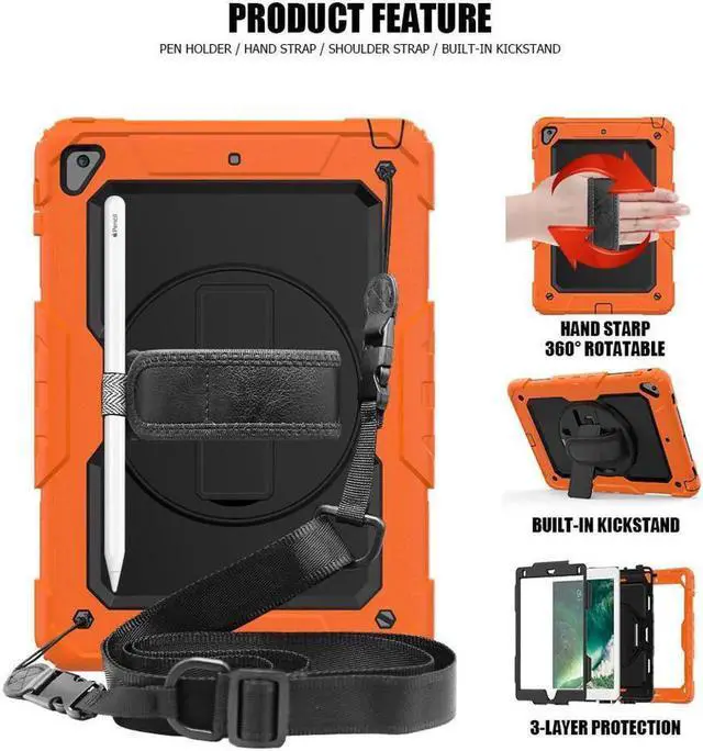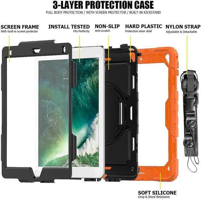 COMPATIBILITY: ONLY for New iPad 5th/6th Generation, as well as iPad Air 2 and iPad Pro 9.7. NOT fit other models. Please confirm the product before purchase. All in One 3 pieces combined installation, heavy duty full-body rugged case, with 360 rotating hand strap/portable shoulder strap, built-in kickstand, screen protector, and polycarbonate hard shell & silicone premium material. 360° Built-in Kickstand The built-in kickstand will set both hands free, whether you are watching video or playing games. 360° rotating Stand allows custome landscape or vertical viewing. Prevention of Drop Damages Effectively keeps iPad away from damages of dropping, bumps and shocks, its excellent safety performance will prolong the lifetime of the iPad 6th/5th. Adjustable/Detachable Shoulder/Hand Strap Adjustable/Detachable Shoulder Strap (total length: 172cm 67in) is more convenient for you to carry iPad. Easy to be attached and removed. With this strap, set your both hands free when you are working, playing game and on vacation, without the need of a purse, bag or backpack. It can hang from anywhere for better entertainment. It is also adjustable to fit with different occasions and for different people. The width is 2.5 cm (1in), which is comfortable when using it. Stylus Pencil Holder An extra Stylus Pencil Holder feature of this new generation case. Easily plug in/out, makes the pencil standing by your working. Unique Design to Protect iPad 6th/5th Better choice for your outdoor travelling, work and business. Create an ultimate protection for tablet, not only 360° Custome angles Hand Strap The adjustable/rotatable hand strap is made from premium soft fabric, fit for kids/adults, comfortable to hold th