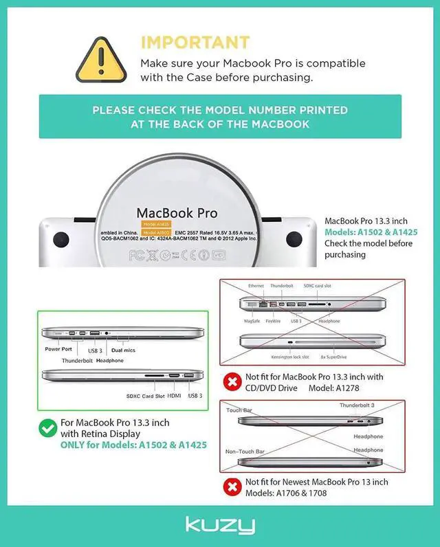 Model: A1425 -- MD212LL/A, MD213LL/A, ME662LL/A, ME664LL/A -- WARNING Case DO NOT FIT Models: A1706 & A1708 & A1278 High Quality Rubberized Series Hard Case Design to fit ONLY MacBook Pro 13.3"