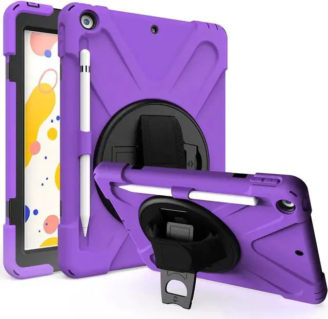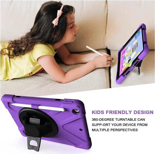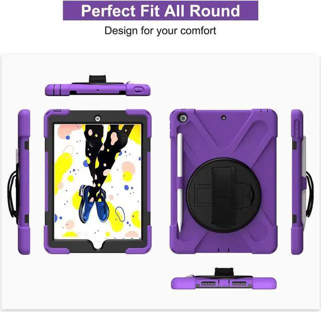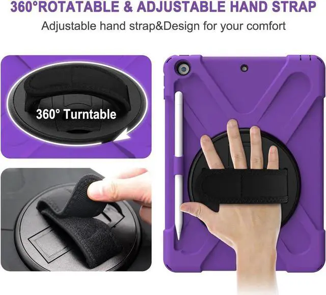 Tablet below: iPad 5th Gen (2017) A1822/A1823 iPad 6th Gen (2018) A1954/A1893 iPad 1, 2, 3 or 4 iPad Pro 10.5 inch iPad Pro 11inch iPad Pro 12.9 inch Any iPad mini Excellent Material for iPad case The case consists durable flexible rubber-like silicone outer frame and 2 pieces combination of hard reinforced inner shell to protects your iPad 10.2 against scratches. We use excellent material. Infinite viewing angles Infinite viewing angles. Vertical? Horizontal? Halfway between? There are no limits, here. Place your iPad at any angle you want. Whether you're reading, typing, or just binging on your favorite TV show, our 10.2 -inch iPad case's adjustable stand does it all. Adjustable Hand-strap Whether it is a child or an adult, you can adjust the tightness of the strap so that users comfortable to master their own tablet. The hand strap can also rotate along with the turntable in the middle. Break-proof design Equipped with flexible rubber-like silicone outer frame and four thicker round corners. It keeps your iPad secure and protect it from bumps, drops, and spills. Shatter- resistance and shock-proof design will greatly enhance your sense of safety.