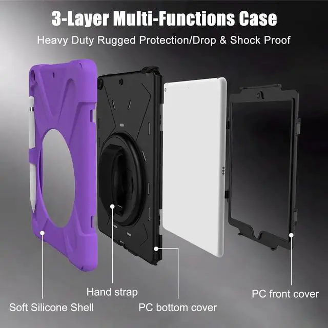 Highlights: Designed exclusively for the iPad 7th Generation 10.2" 2019, model for A2197/A2198/A2200 Precise cut allows full access to all ports, functions and buttons. Built-in Kickstand for the convenience of watching videos and chatting You can carry tablet with should belt and even hang it on your car seat. You can also hang it in other place you need, such as kitchen or bedroom. Inner hard polycarbonate clamshell with external soft silicone cushion coating to offer max protection and optimum comfortable grip. With built-in elastic pencil holder makes it easy to pull out and store your Apple pencil.