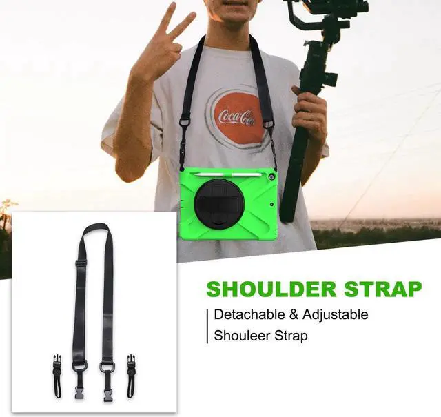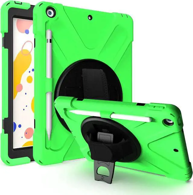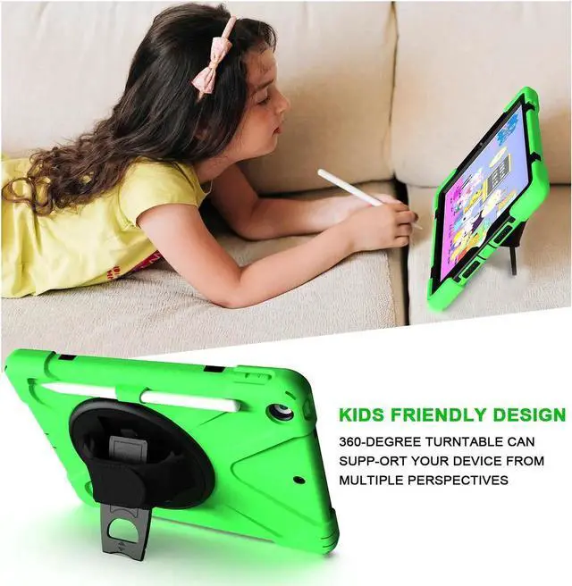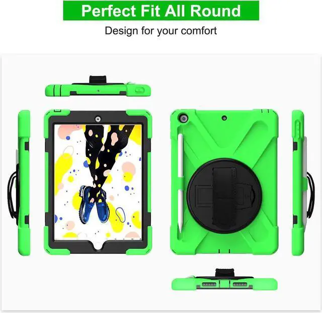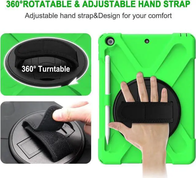 Tablet below: iPad 5th Gen (2017) A1822/A1823 iPad 6th Gen (2018) A1954/A1893 iPad 1, 2, 3 or 4 iPad Pro 10.5 inch iPad Pro 11inch iPad Pro 12.9 inch Any iPad mini Excellent Material for iPad case The case consists durable flexible rubber-like silicone outer frame and 2 pieces combination of hard reinforced inner shell to protects your iPad 10.2 against scratches. We use excellent material. Infinite viewing angles Infinite viewing angles. Vertical? Horizontal? Halfway between? There are no limits, here. Place your iPad at any angle you want. Whether you're reading, typing, or just binging on your favorite TV show, our 10.2 -inch iPad case's adjustable stand does it all. Adjustable Hand-strap Whether it is a child or an adult, you can adjust the tightness of the strap so that users comfortable to master their own tablet. The hand strap can also rotate along with the turntable in the middle. Break-proof design Equipped with flexible rubber-like silicone outer frame and four thicker round corners. It keeps your iPad secure and protect it from bumps, drops, and spills. Shatter- resistance and shock-proof design will greatly enhance your sense of safety.